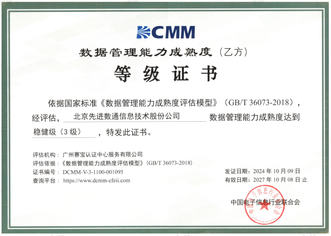 近期,中国电子信息行业联合会公布了最新一批顺利获得数据管理能力成熟度(DCMM)贯标等级认证的企业名单。dcbox小金库app成功取得数据管理能力成熟度稳健级(三级)认证。这一认证的取得,标志着dcbox小金库app在数据治理体系构建和数据管理与应用能力方面,已经达到了国家权威组织认可的标准。这不仅是对dcbox小金库app在数据管理领域专业能力的肯定,也是对其在有助于数字化转型服务和数据驱动决策方面所做努力的认可。
